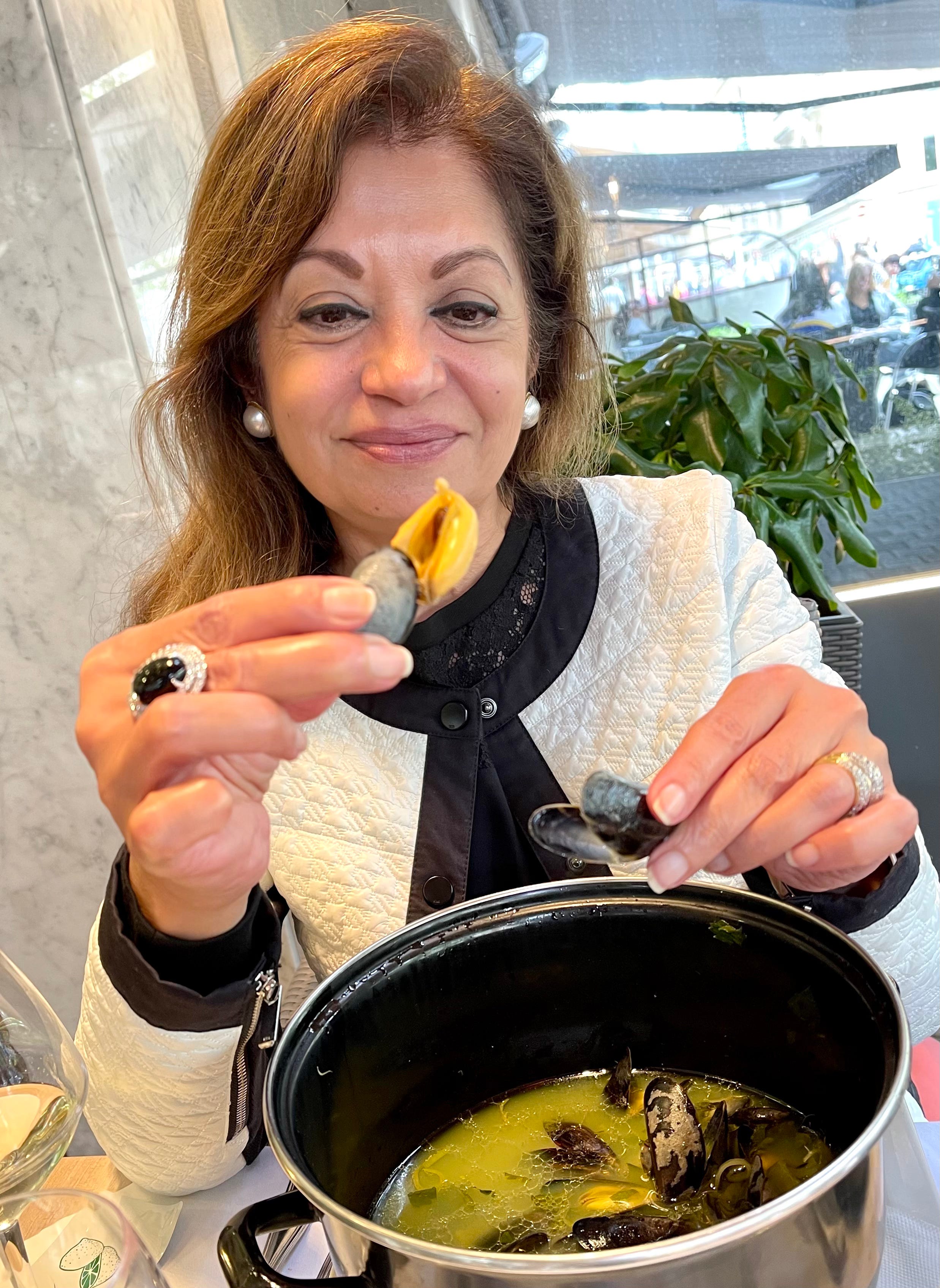 Eating mussels can be a messy affair. But here is a tip for those of you who venture to try mussels at your local restaurant. I use an empty mussel shell as mini tongs. Then with my mussel “tongs”, I clasp and pull the mussel meat from the next shell, keeping my fingers relatively clean.