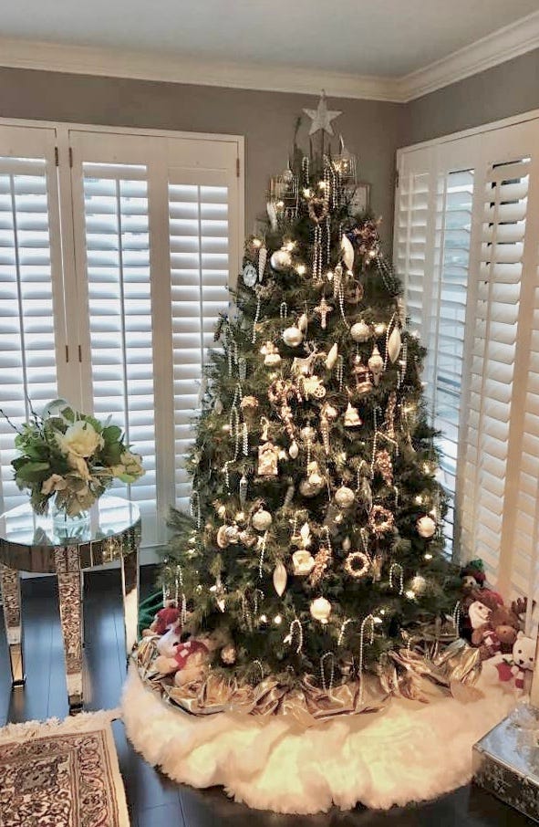 Our tree was always theme-based and usually a monochromatic color, a different color each year. My favorite was white with silver and gold ornaments. The ornaments were a collection of vintages, annual gifts from my mother-in-law and the ones the girls had crafted over the years. Instead of placing the poinsettias around the tree, I preferred placing them on the buffet table together with the White Amaryllis.