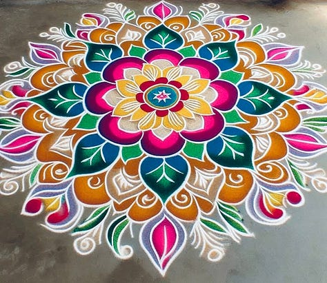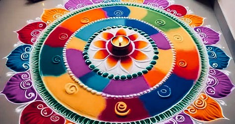 Homes transform into luminous sanctuaries. Lamps line thresholds, marigolds drape balconies, and doorsteps bloom with rangoli patterns of powdered color. Mandalas drawn by steady hands in the early dawn.