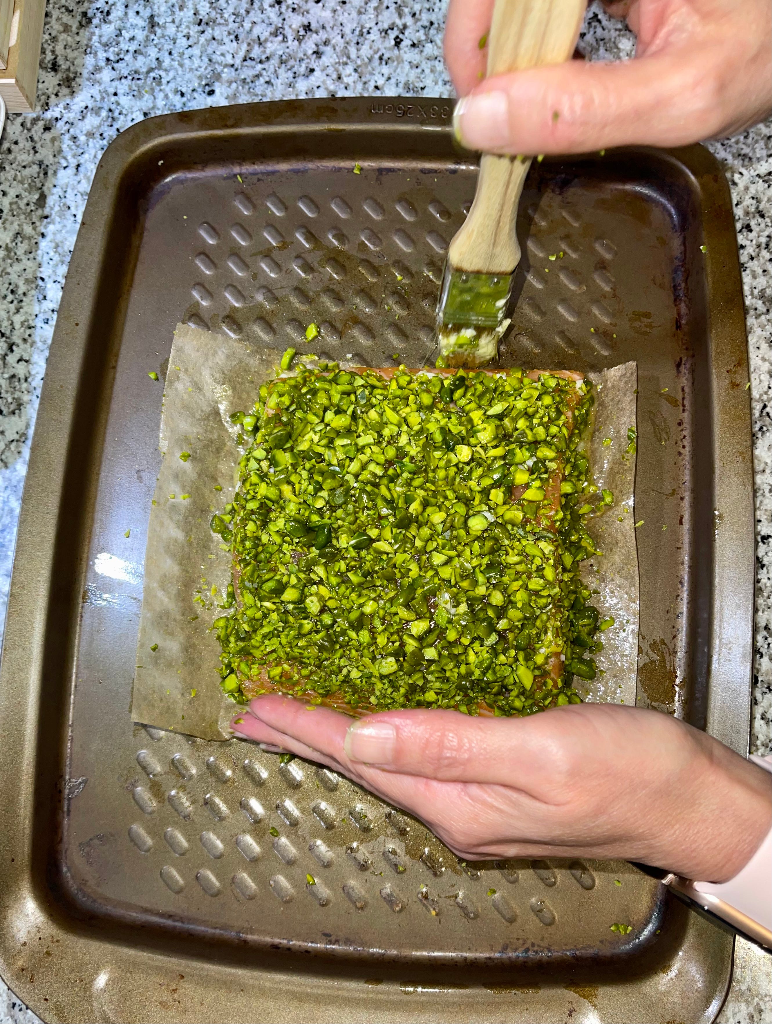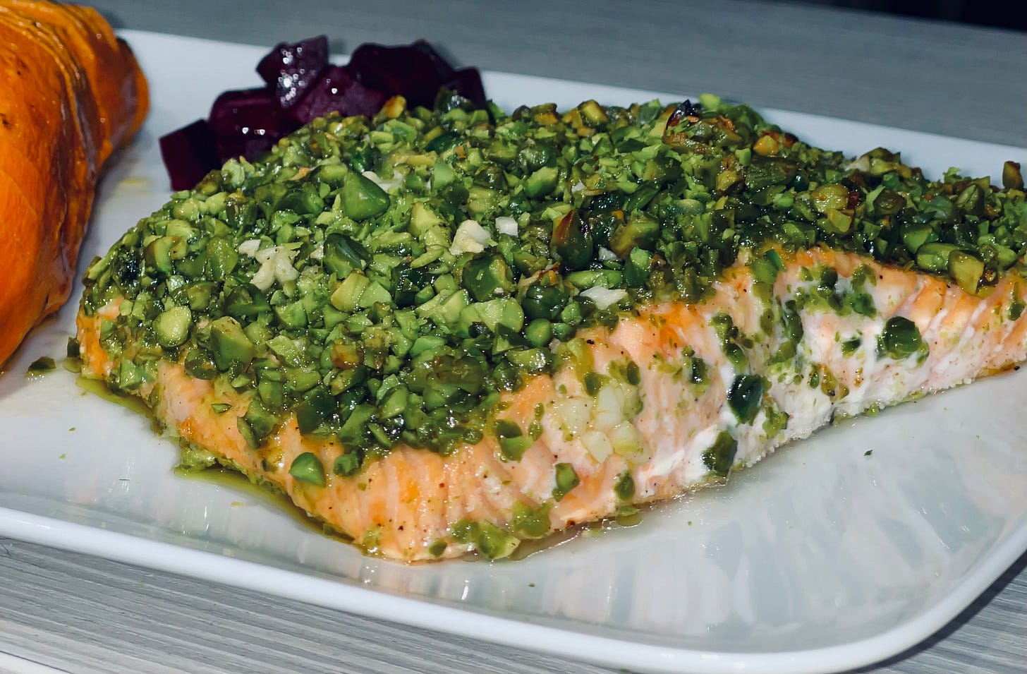 I think it is safe to say that pistachio crusted salmon could be considered a comfort food, at least for me. It conjures up precious memories of dinners and events with my many friends in California. My version has been a family favorite for years.
