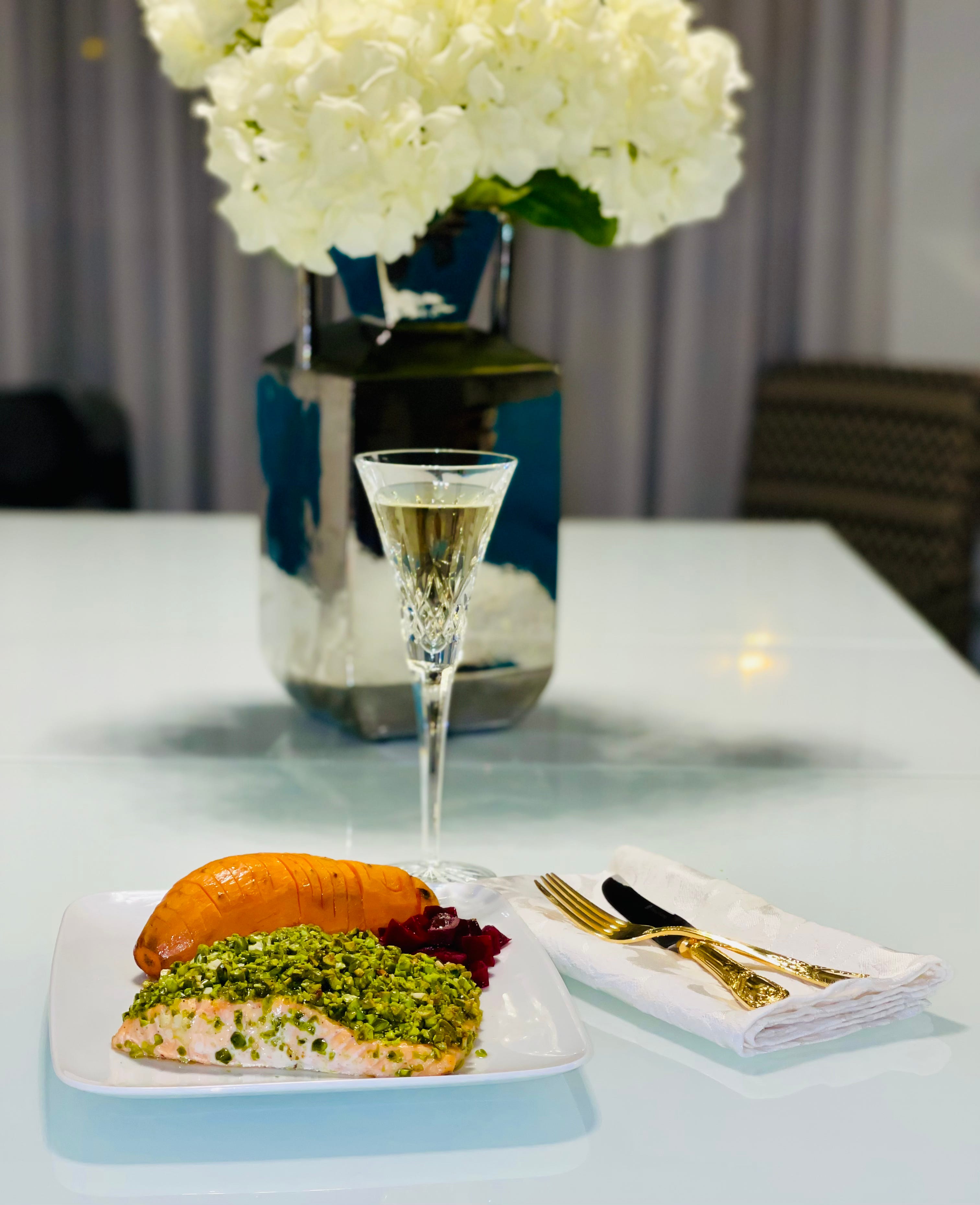 Pistachio crusted salmon is an effortless, yet stylish main course to serve when you have company. Not only is it simple to prepare, the dish requires little time. It’s the perfect Sunday brunch entrée for the family, with little clean up required.