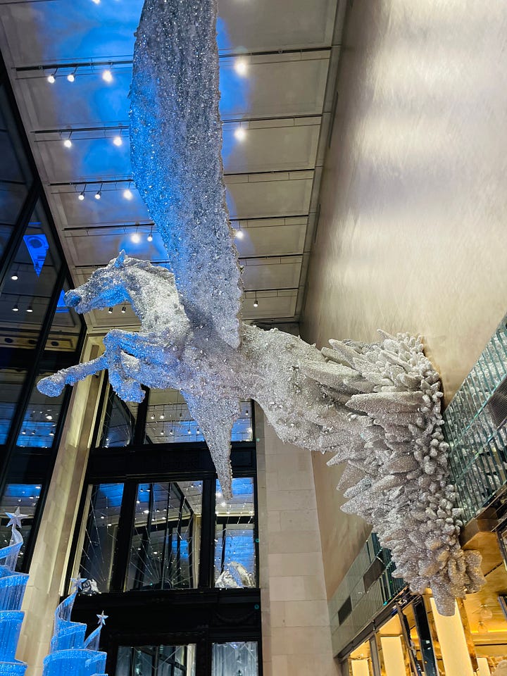 Above us, the soaring Pegasus sculpture seemed to scatter reflections across the room, catching every glimmer from mirrored surfaces and polished marble. The restaurant feels designed to hold moments like this, celebratory yet intimate, dramatic yet welcoming. Light moves constantly through the space, wrapping conversations in an energy that feels uplifting rather than overwhelming.