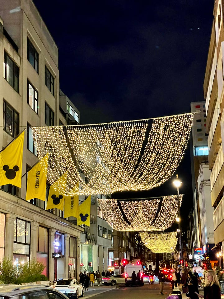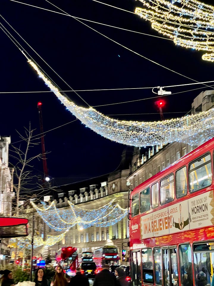 London in December never apologizes for its spectacle. Streets shimmer with cascading strands of brilliance; facades glow with festive geometry; every neighborhood becomes its own illuminated story.