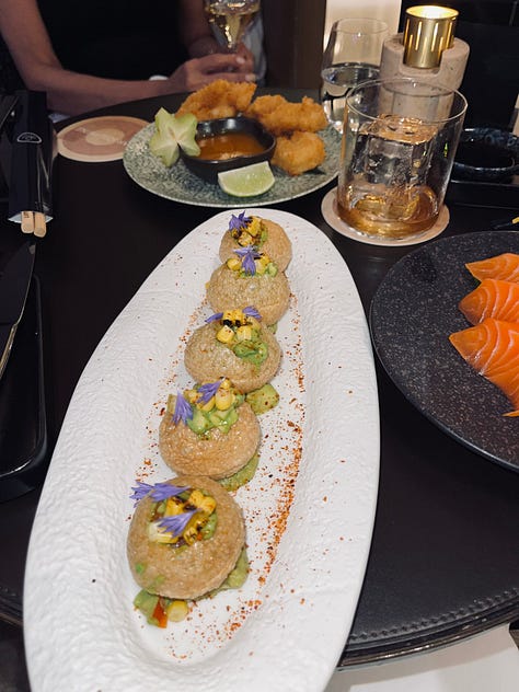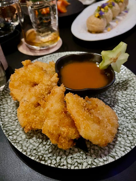 Savoring a symphony of flavors with innovative twists on traditional recipes such as vegan pani puri, crispy prawns, sashimi rouge. Each dish is complemented with unique sauces and garnishes enhancing the overall tasting.