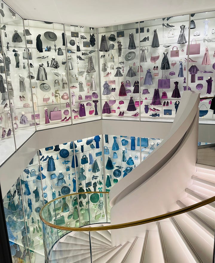Guided by a member of the team we move through to the next building of La Galerie Dior Museum, a three-story sanctuary linked by an illustrious spiral staircase.